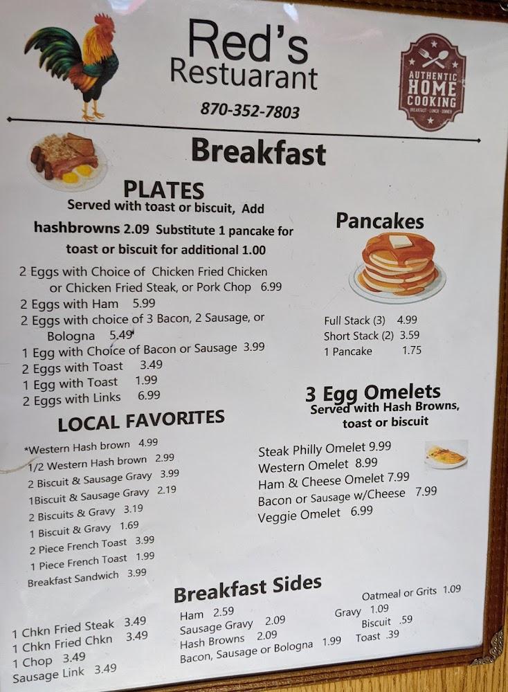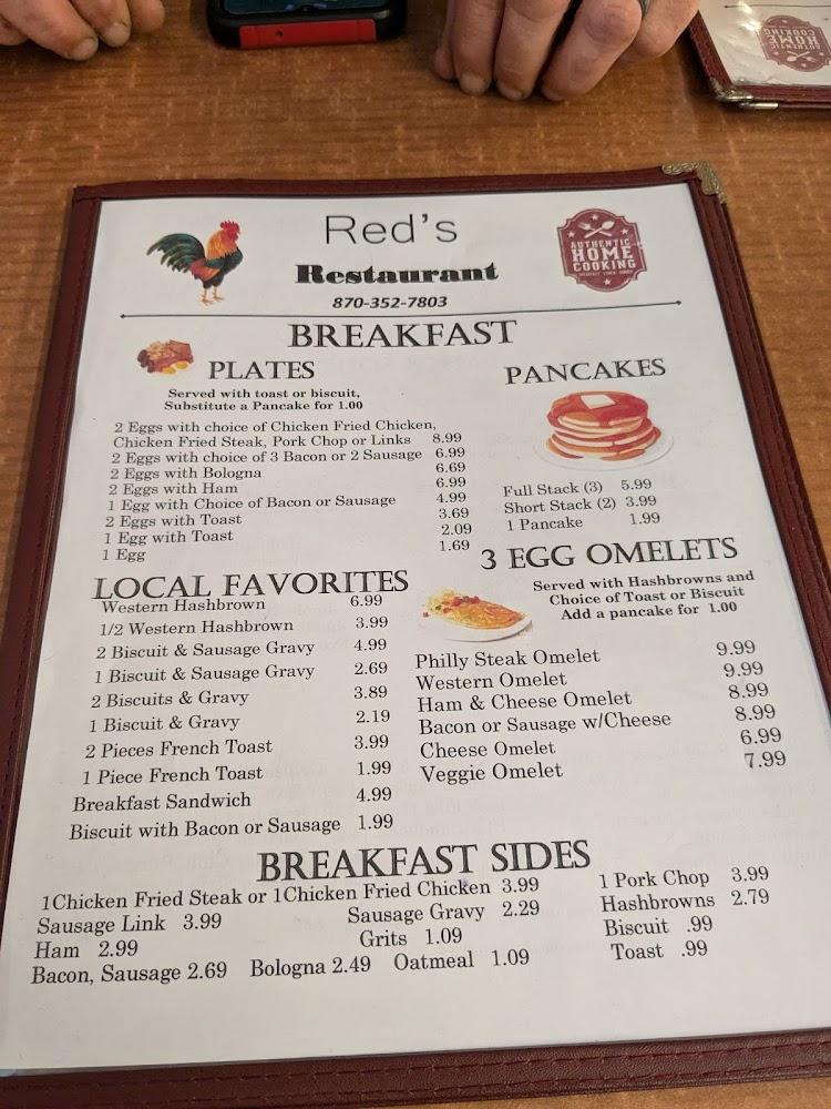 The menu at Red's Restaurant captures the essence of southern cuisine. Breakfast, lunch, and dinner options cater to diverse appetites. Breakfast offers favorites like pancakes and Western omelets, with an average price of $5.66. Lunch features easy-to-enjoy meals such as the Hamburger Steak, averaging $6.44. Dinner highlights include Chicken Fried Steak and delicious grilled catfish, typically priced around $10.79. Simple portions make sharing easy, and each dish reflects traditional cooking styles. Seasonal specials keep the menu fresh, inviting diners to return regularly. Red's balances comfort food with healthy options, ensuring everyone finds something they love, creating a menu as hearty as it is varied.